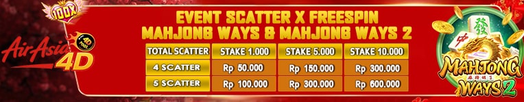 *STAKE SPIN MIN BET 1.000 - 4.999: 5 SCATTER - BONUS 50.000 6 SCATTER - BONUS 100.000 *STAKE SPIN MIN BET 5.000 - 9.999: 5 SCATTER - BONUS 150.000 6 SCATTER - BONUS 300.000 *STAKE SPIN MIN BET 10.000 - 99.999: 5 SCATTER - BONUS 300.000 6 SCATTER - BONUS 600.000 Syarat & Ketentuan : 1. Event Scatter Berlaku hanya pada provider Slot Pragmatic yang ada di menu utama Slot Pragmatic (Bukan dimenu SBO Slot & Games). 2. Minimal Stake SPIN Rp. 1.000,- 3. Event ini Khusus Untuk Jenis Slot PRAGMATIC Pada List Di Bawah Ini. - Gates of Olympus - Gates of Olympus 1000 - Gates of Olympus Dice - Starlight Princess - Starlight Princess 1000 - Starlight Christmas - Gates of Gatot Kaca - Gates of Gatot Kaca 1000 4. Event tidak berlaku jika claim dengan menggunakan fitur BUYSPIN/BELI SPIN. 5. Maksimal Per 1x claim Bonus Scatter Rp.333.333 Dan Maksimal Claim 3x Perhari, Maksimal Bonus Rp. 1.000.000 / Perhari.( PER 1 USER ID ) 6. Setelah Mendapatkan Scatter Wajib Langsung Screen Shoot Yang Menunjukkan Hasil Akhir Dari Total Kemenangan. (Screenshoot layar penuh / full screen dan tidak boleh ada editan) 7. Boleh Dimainkan Atau Tunggu Sampai Freespin Selesai ,Wajib Screenshoot Hasil akhir Total Kemenangan. 8. Diwajibkan posting Screenshoot hasil di Grup Official Facebook AIRASIA4D Disertai Username Dan Jenis Claim : Contoh : - Username = AIRASIA4D - jenis Claim = Event Scatter Maka Format Postingan Adalah Hasil SS Di Sertai Username Dan Jenis Claim AIRASIA4D Event Scatter 9. Klaim Bisa Dilakukan Melalui Admin LiveChat Official AIRASIA4D. 10. Event Scatter akan Di Reset Setiap Hari Pukul 00.00 WIB 11. Promo dapat berubah sewaktu-waktu tanpa pemberitahuan. 12. Jika ditemukan indikasi kecurangan, Management berhak membatalkan event tersebut dan menarik kembali bonus dan kemenangan, serta memberikan peringatan keras kepada user id yang telah melakukan kecurangan. 13. Event Tidak Berlaku Double Claim Dengan Event Yang Lain ( 1X Claim Hanya Untuk 1 Event ) 14. Keputusan Management AIRASIA4D bersifat Mutlak.