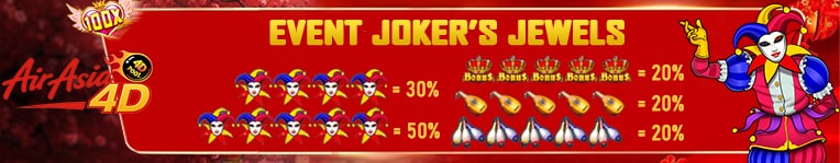 1. Event hanya berlaku khusus permainan Provider PRAGMATIC JOKER'S JEWELS (Bukan dimenu SBO Slot & Games) 2. Minimal Stake adalah Rp500 Untuk Mengikuti Event JOKER'S JEWELS 3. Kombinasi Line Harus Saling Terhubung Atau Konek Baru Bisa Di Klaim ( bonus di hitung dari total kemenangan line ) 4. Maksimal klaim bonus 3x dalam sehari. 5. Minimal Klaim Bonus Rp 20,000 Maksimal Bonus Per 1x klaim Adalah Rp 500,000 6. Maximal Bonus yang diberikan adalah Rp 1,000,000 / Perhari.( PER 1 USER ID ) 7. Diwajibkan posting Screenshoot hasil akhir total kemenangan di Grup Official Facebook AIRASIA4D dengan hastag : AIRASIA4D EVENTJOKERAIRASIA4D CLAIMJOKERAIRASIA4D 8. Klaim Bisa Dilakukan Melalui Admin Whatsapp Atau LiveChat Official AIRASIA4D . Bonus akan diberikan paling lama 5-30 menit setelah dilakukan pengecekan oleh Customer Service kami. 9. Apabila terdapat indikasi kecurangan maka kami berhak membatalkan hadiah bonus extra tersebut. 10. Apabila kami mendapatkan ScreenShoot PALSU / EDITAN maka user id tersebut akan kami BLACKLIST dari event dan tidak akan bisa claim hadiah event di lain waktu. 11. Semua keputusan dari Management AIRASIA4D bersifat mutlak dan tidak dapat diganggu gugat. KOMBINASI JOKER JEWEL'S EXTRA BONUS Minimal Stake Adalah 500 5 KEPALA JOKER 50% DARI TOTAL KEMENANGAN 4 KEPALA JOKER 30% DARI TOTAL KEMENANGAN 5 MAHKOTA 20% DARI TOTAL KEMENANGAN 5 GUITAR 20% DARI TOTAL KEMENANGAN 5 BOWLING 20% DARI TOTAL KEMENANGAN