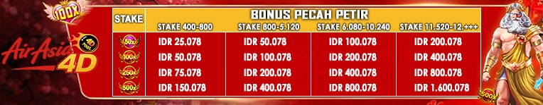 *Stake 400 - 800 PECAH PETIR x50 = 25.078 PECAH PETIR x100 = 50.078 PECAH PETIR x250 = 75.078 PECAH PETIR x500 = 150.078 *Stake 900 - 5.120 PECAH PETIR x50 = 50.078 PECAH PETIR x100 = 100.078 PECAH PETIR x250 = 200.078 PECAH PETIR x500 = 400.078 *Stake 6.080 - 10.240 PECAH PETIR x50 = 100.078 PECAH PETIR x100 = 200.078 PECAH PETIR x250 = 400.078 PECAH PETIR x500 = 800.078 *Stake 11.520 - 12.+++ PECAH PETIR x50 = 200.078 PECAH PETIR x100 = 400.078 PECAH PETIR x250 = 800.078 PECAH PETIR x500 = 1.600.078 Syarat & Ketentuan : 1. Event Pecah Petir Berlaku hanya pada Provider Slot Pragmatic yang ada di menu utama Slot Pragmatic (Bukan dimenu SBO Slot & Games). 2. Event ini Berlaku Khusus Untuk Game Slot PRAGMATIC Play Pada List Di Bawah Ini : - Gates of Olympus - Gates of Olympus 1000 - Gates of Olympus Dice - Starlight Princess - Starlight Princess 1000 - Starlight Christmas - Gates of Gatot Kaca - Gates of Gatot Kaca 1000 3. Minimal Stake SPIN Adalah Rp. 400,- 4. Apabila Dalam Satu Periode Spin Atau Dalam Satu FreeSpin Mendapatkan Beberapa Perkalian Pecah Petir, Maka Yang Di Hitung Adalah Perkalian Yang Paling Besar. Contoh perhitungan Event Pecah Petir : - Anda Stake Spin Dengan Nominal Rp 11,520 Dan Di Saat Sedang Spin Biasa Kemudian Mendapatkan MAXWIN Dengan Perkalian Petir X50 , X100 ,X250 Dan X500 Sekaligus Maka Hitungan Yang Di Ambil Adalah Perkalian Petir Paling Besar Yaitu X500 Yang Berarti Anda Akan Mendapatkan Bonus Event Pecah Petir Senilai Rp 533,333 ( Max Per 1x claim Nominal Bonus Sesuai Stake Spin ) - Anda Buy FreeSpin Dengan Nominal Rp 40,000 ( Hitungan Stake Rp 400 ) Dan Di Saat Sedang Dalam FreeSpin Kemudian Mendapatkan MAXWIN Dengan Perkalian Petir X50 , X100 ,X250 Dan X500 Sekaligus Maka Hitungan Yang Di Ambil Adalah Perkalian Petir Paling Besar Yaitu X500 Yang Berarti Anda Akan Mendapatkan Bonus Event Pecah Petir Senilai Rp 150,078 ( Nominal Bonus Sesuai Stake Spin ) 5. Maksimal Per 1x claim Bonus Petir Rp.533.333, Maksimal Claim 3x Perhari, Maksimal Bonus Rp. 1.600.078 / Perhari.( PER 1 USER ID ) 6. Setelah Mendapatkan Pecah Petir Wajib Langsung Screen Shoot Yang Menunjukkan Hasil Akhir Dari Total Kemenangan. (Screenshoot layar penuh / full screen dan tidak boleh ada editan) 7. Apabila Posisi Mendapatkan Freespin Boleh Dimainkan Atau Tunggu Sampai Freespin Selesai ,Wajib Screenshoot Hasil akhir Total Kemenangan. 8. Klaim Bisa Dilakukan Melalui Admin LiveChat AIRASIA4D. 9. Event Pecah Petir akan Di Reset Setiap Hari Pukul 00.00 WIB 10. Promo dapat berubah sewaktu-waktu tanpa pemberitahuan. 11. Jika ditemukan indikasi kecurangan, Management berhak membatalkan event tersebut dan menarik kembali bonus dan kemenangan, serta memberikan peringatan keras kepada user id yang telah melakukan kecurangan. 12. Diwajibkan posting Screenshoot hasil di Grup Official Facebook AIRASIA4D Disertai Username Dan Jenis Claim : Contoh : - Username = AIRASIA4D - jenis Claim = Event Pecah Petir Maka Format Postingan Adalah Hasil SS Di Sertai Username Dan Jenis Claim AIRASIA4D Event Pecah Petir 13. Event Tidak Berlaku Double Claim Dengan Event Yang Lain ( 1X Claim Hanya Untuk 1 Event ) 14. Keputusan Management AIRASIA4D bersifat Mutlak dan tidak bisa di ganggu gugat.